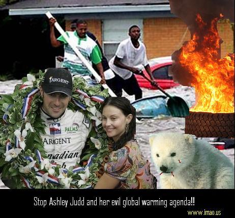 Yes, Ashley Judd contributes to global warming! How? Her husband gets in a car, and DELIBERATELY drives around in circles. Sure, other husbands do this too, but normally it’s because we refuse to stop and ask for directions. Ashley’s husband, race car driver Dario Franchitti, does this for a living. Or used to before a benevolent God broke his pelvis and put him out of business for a while.